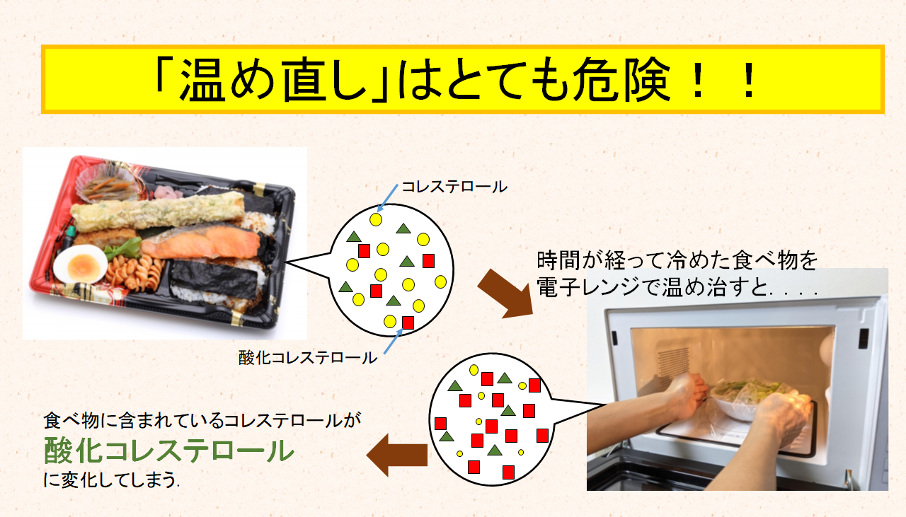 その点、特に注意が必要なのが電子レジでの再加熱です。 加熱料理をする際には便利な道具のひとつですが、何度も温め直したり、10分以上加熱したりすると、もともとの食べ物に含まれているコレステロールが酸化コレステロールに変化してしまいます。また、天ぷらやフライなどを二度揚げすることもおすすめしません。