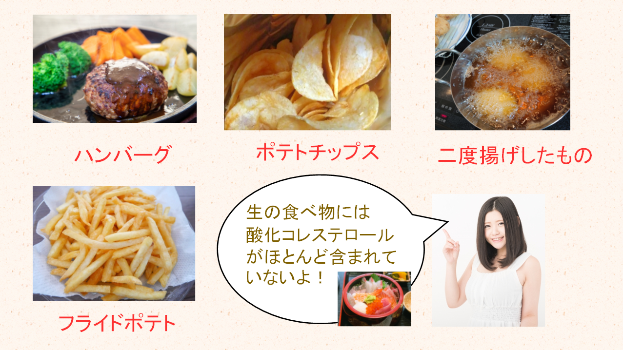 その一方で、生のものには酸化コレステロールがほとんど含まれていません。こういったことより、食事では高温で調理したものが多くなりすぎないように、バランスよく調理することでリスクを減らすことができるのです。