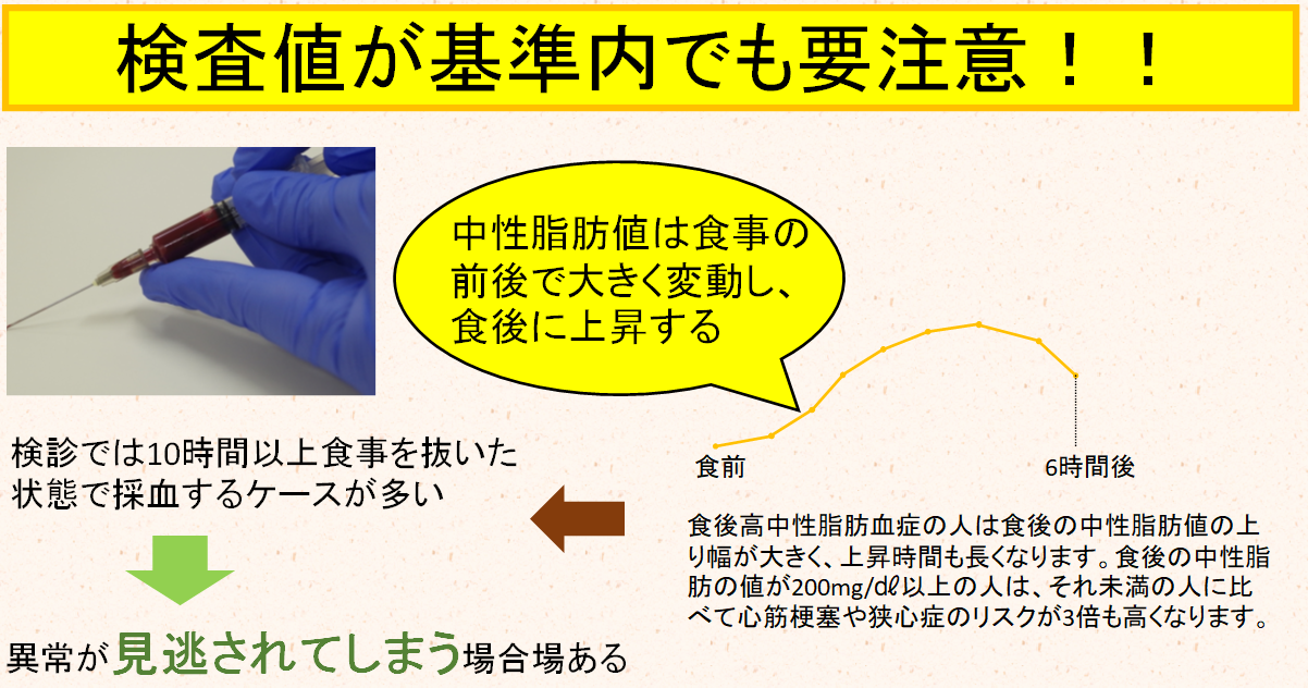 それは、検診では、「食後高中性脂肪血症」が見逃されがちだからです。