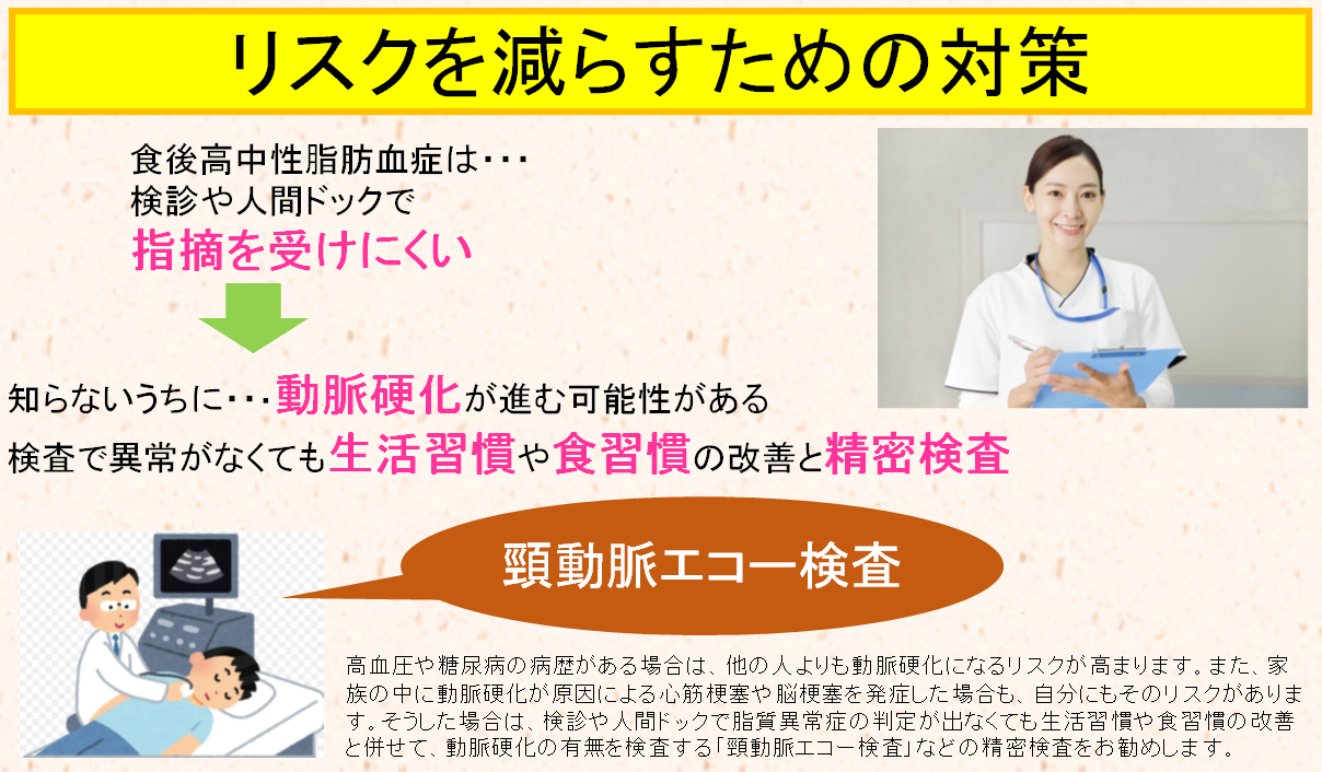 また食後高中性脂肪血症は、遺伝的な体質が要因となることもあるため、動脈硬化が原因による脳梗塞や心筋梗塞を発症した家族がいる人は、特に注意が必要です。