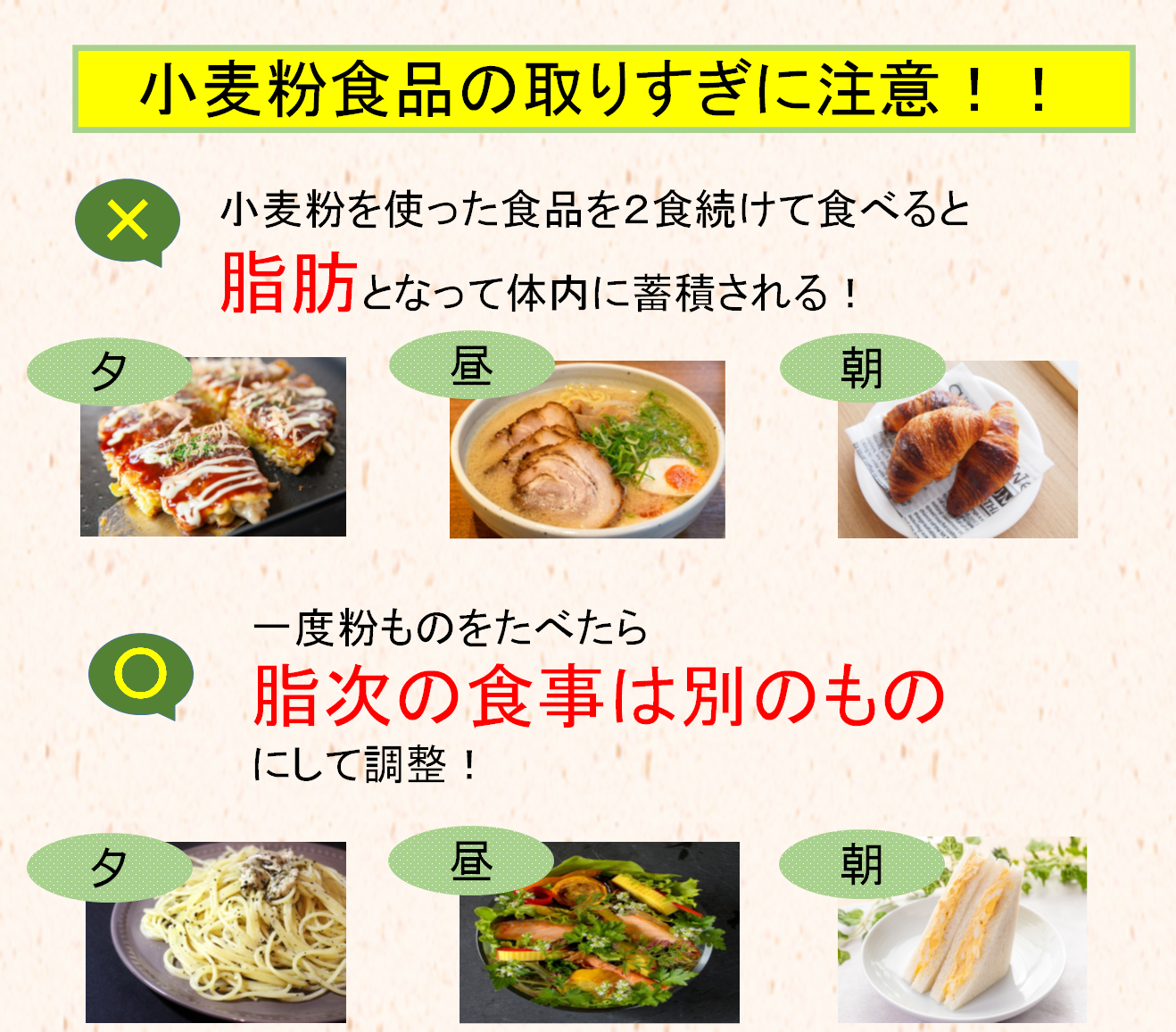 1回の食事で粉ものが主食の場合、次回の主食は粉ものを避けましょう。また、パスタやパンなどを