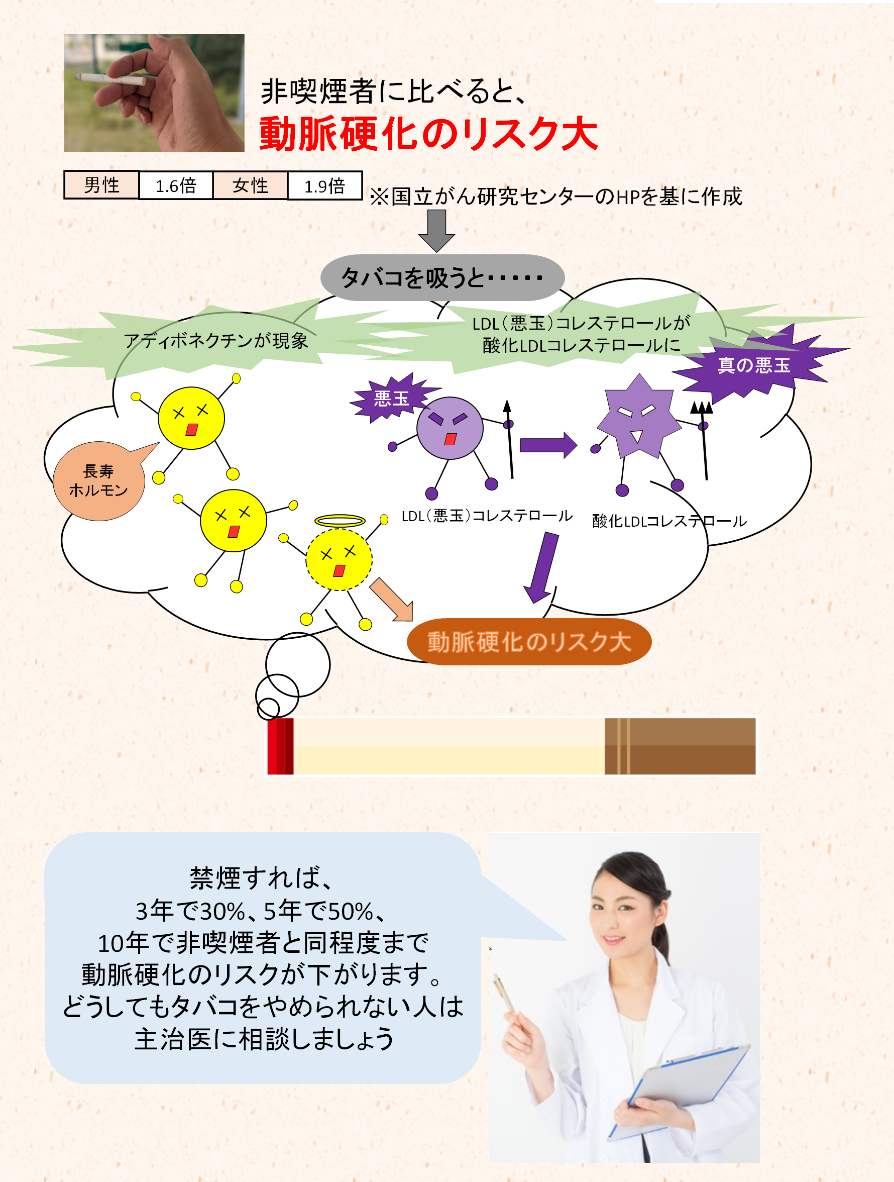 タバコを吸うと、LDLコレステロールの酸化が進み、HDLコレステロールが減り、動脈硬化が進んで血栓ができやすくなることがわかっています。