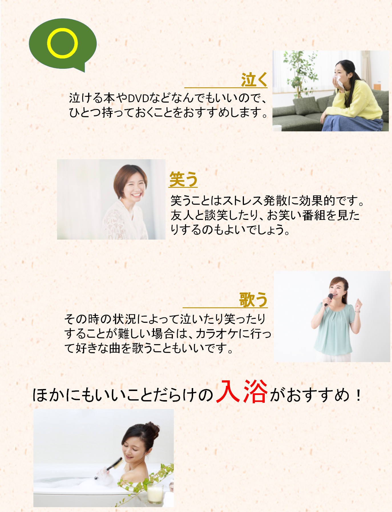 例えば、深呼吸や静かな場所でのアロマ、泣ける映画や本、笑うこと、歌を歌うことなどが効果的です。このほかでは、入浴もおすすめです。リラックス効果が得られるだけでなく、一日の疲労を解消してくれて、代謝もよくなります。