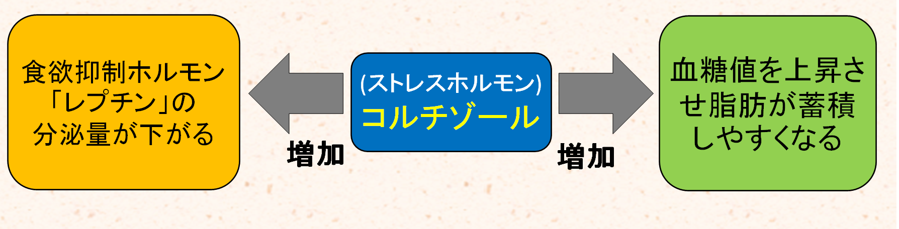 また、ストレスがかかるとそれに対抗するために副腎から分泌されるストレスホルモン「コルチゾール」の分泌量が増えます。コルチゾールが増えると、食欲抑制ホルモン「レプチン」の分泌量が低下して食べる量が増えるのです。さらに、ストレスは、「グルカゴン」や「アドレナリン」などのホルモンを分泌させ、血糖値を上昇させて脂肪を蓄えやすくしてしまします。