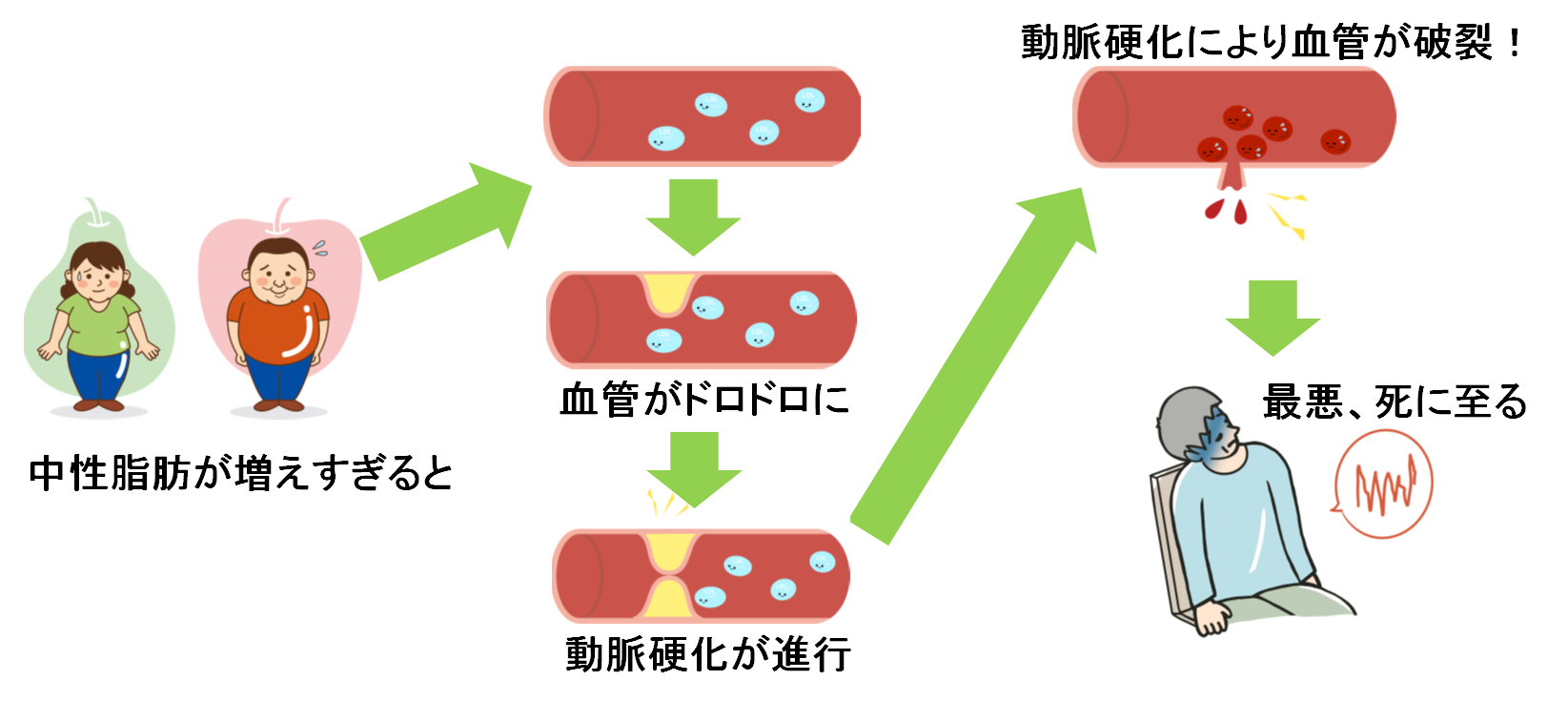 中性脂肪は糖質から合成され、その後血液中に放出されます。血液中の中性脂肪の量が多くなると、血液はドロドロになり血管内をスムーズに流れなくなります。血液の流れが悪くなると血管は傷ついて「動脈硬化」を進行させます。